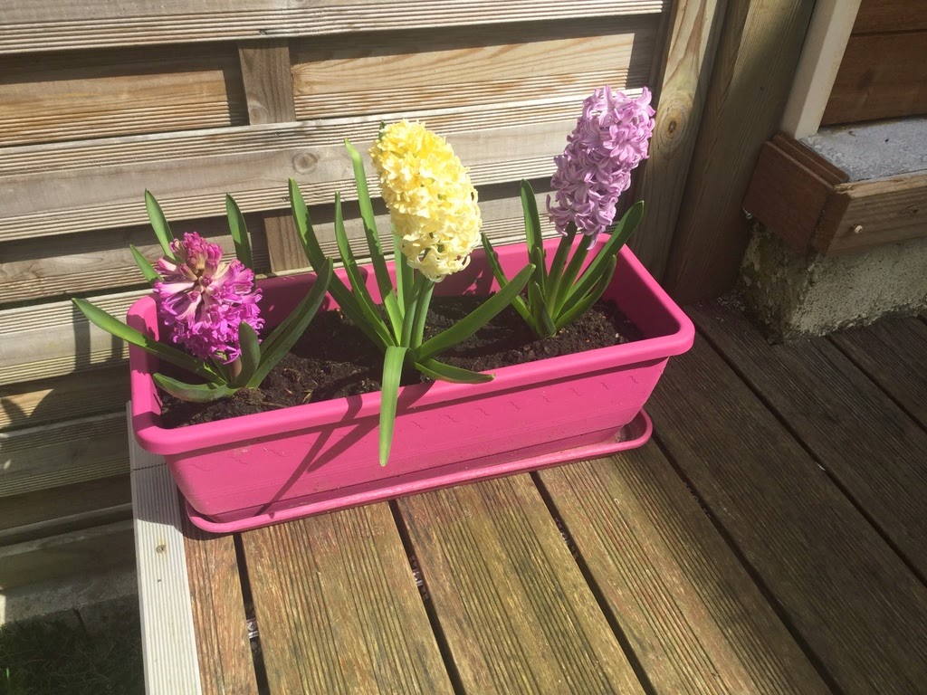 Avec quelques semaines de retard, quelques photos du jardin pendant ce printemps. Les jacinthes ont bien poussé dans les jardinières. Les oeillets de chine plantés au mois de septembre dernier de manière "provisoire" (ils étaient destinés à être enlevés au printemps, je les avais laissés pour éviter que les chats ne viennent gratter dans mes plate-bandes) ont survécu à l'hiver et ont prospéré. Ils sont maintenant magnifiques, je pense qu'ils vont rester un moment en place!
